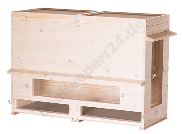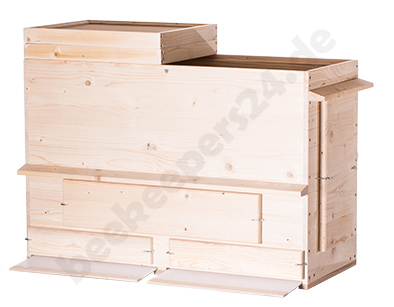 Für 22 Rähmchen 327 x 448 mm. Außenmaße Einraumbeute: L840 x B350 x H570 mm. Hergestellt aus24 mm Fichtenholz (stabverleimt/ wasserfest). Eckverbindungen verleimt und verschraubte (Edelstahl Schrauben).