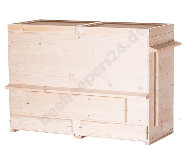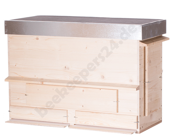 Der Bodenteil besteht aus Edelstahlgitter (2,7 mm) mit zwei Kunststoffladen von hinten ausziehbar (ohne Bienenkontakt), Hartholzleisten dienen als Auflage der Beute und sorgen für eine längere Lebensdauer.
