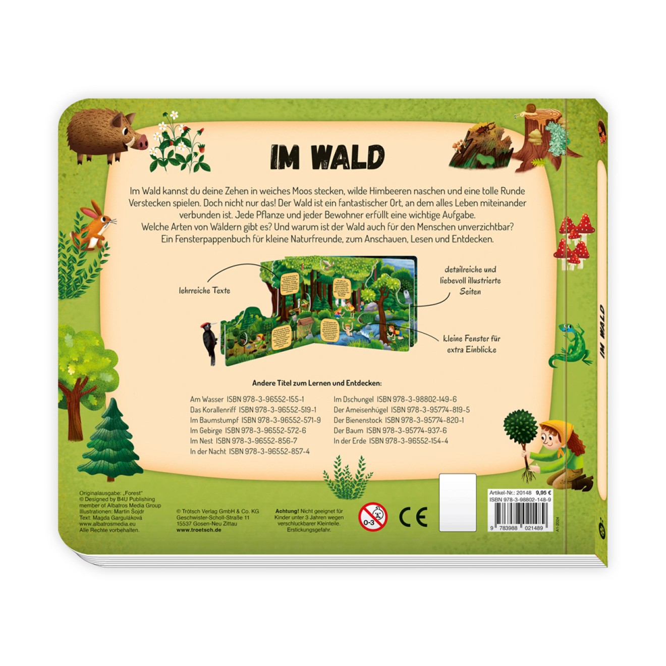 Mit diesem detailreich und liebevoll gestalteten Fensterbuch können Kinder die unterschiedlichen Seiten des Waldes entdecken. Durch viele kleine Gucklöcher tauchen kleine Entdecker mit jeder Seite tiefer in den Wald ein und sammeln dabei faszinierende Fakten über den wichtigen Lebensraum und seine Bewohner. Die extra Einblicke und die kurzen Texte vermitteln Kindern von 3 bis 6 Jahren leicht verständlich wertvolles Naturwissen. Ein Sachbuch zum Anschauen, Lesen und Entdecken!