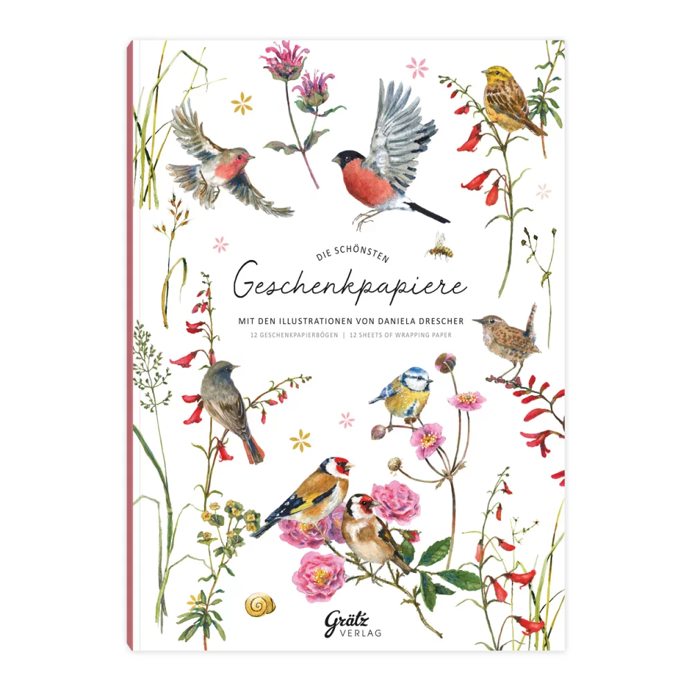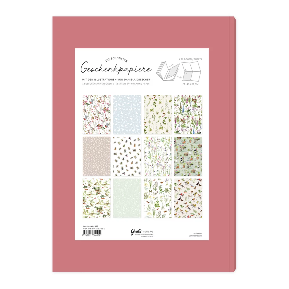 Zwölf Geschenkpapierbögen mit Naturmotiven von Daniela Drescher. Mit naturnah gezeichneten Wildblumen und Vöglen. Auseinandergefaltet sind die Bögen 51 mal 71 Zentimeter groß.