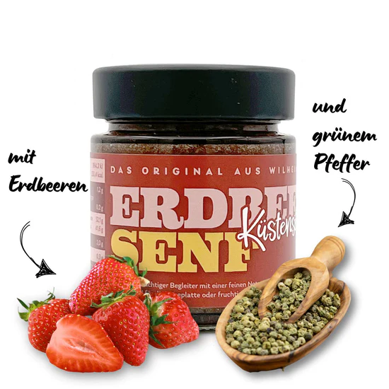 Der Erdbeersenf bietet eine harmonische Kombination aus süßen Erdbeeren und einer dezenten Schärfe (Dijon Art), die Ihre Käseauswahl perfekt ergänzt. Ob mild oder pikant, der Erdbeersenf sorgt für eine Geschmacksexplosion und eine wahre Sinnesfreude. Genießen Sie, wie sich die süße Frische der Erdbeeren mit der leichten Schärfe des Pfeffers vereint und Ihnen einen ganz besonderen Genussmoment beschert.