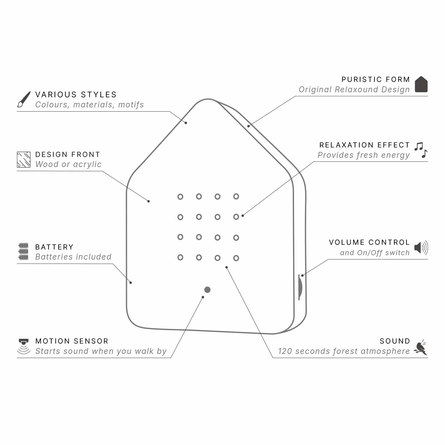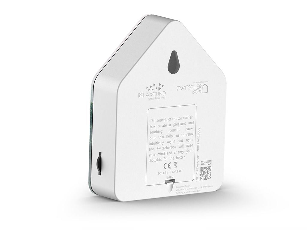 Unsere Relaxound Zwitscherbox schenkt Dir wertvolle Momente der Entspannung. Beruhigende Natursounds lassen Dich durch einen morgendlichen Wald wandeln: Das fröhliche Zwitschern von Amseln und anderen Singvögeln beruhigt sofort. Du spürst, wie sich Kopf und Körper intuitiv entspannen und frei werden.
