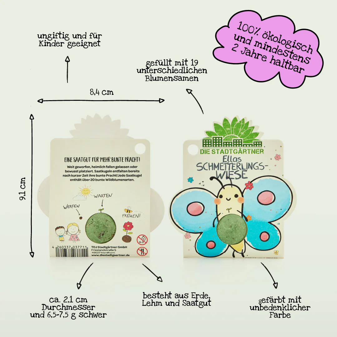 Nachhaltige Geschenkidee für Kinder: Kunterbunte große Samenbombe mit Wildblumen-Saatgut. Die Farbe der Blumenmurmel wird zufällig ausgewählt.
