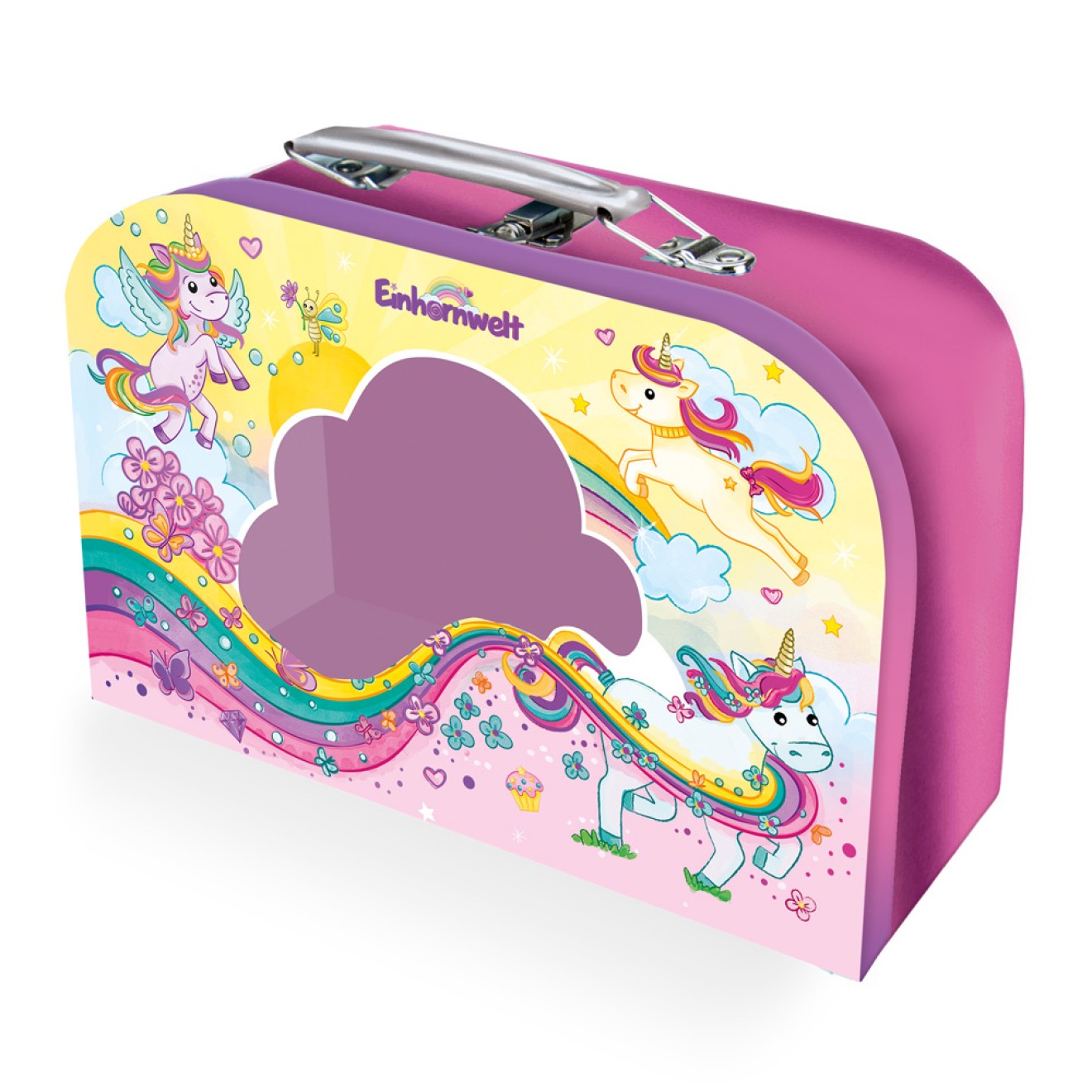 Kinderkoffer mit Fenster und Glitzerfolie gefüllt Einhornwelt