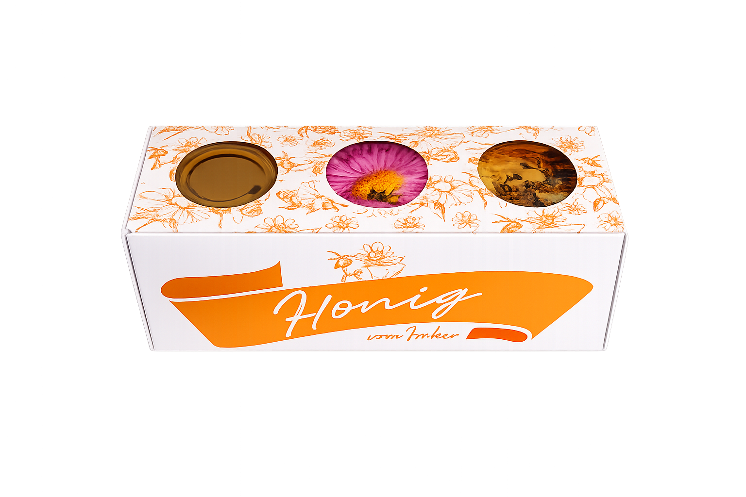 Die dekorative Verpackung bietet Platz für drei 50-g-Gläser und eignet sich ideal, um unterschiedliche Honigsorten attraktiv zu präsentieren. So entsteht im Handumdrehen ein geschmackvolles Geschenkset für Genießer, Feinschmecker und Honigliebhaber.