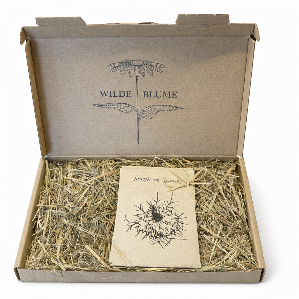 Das Set ist liebevoll gebunden, jede Samentüte mit einer handgezeichneten Blüte dekoriert und in duftendem Heu eingebettet.