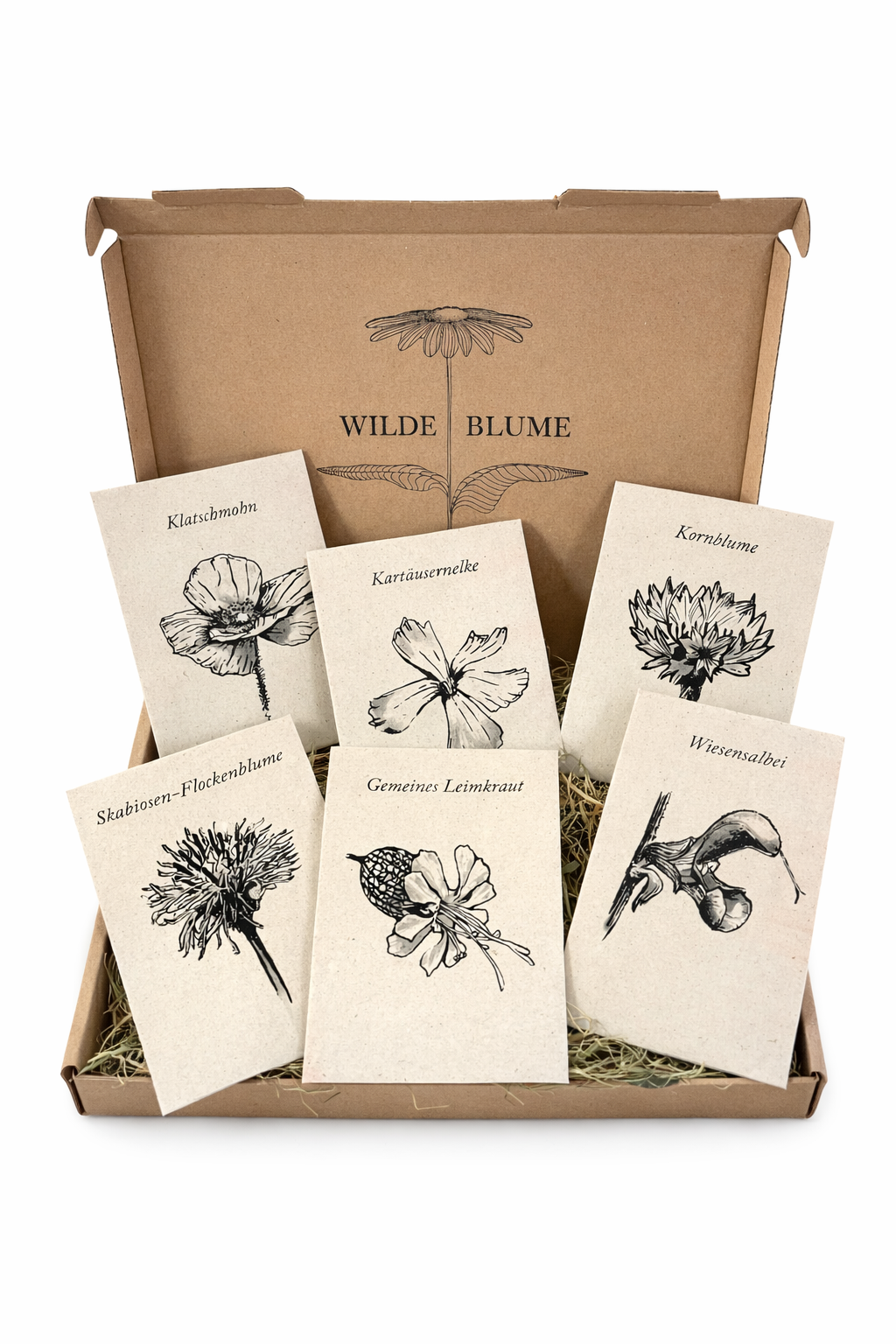 Das Set ist liebevoll gebunden, jede Samentüte mit einer handgezeichneten Blüte dekoriert und in duftendem Heu eingebettet.