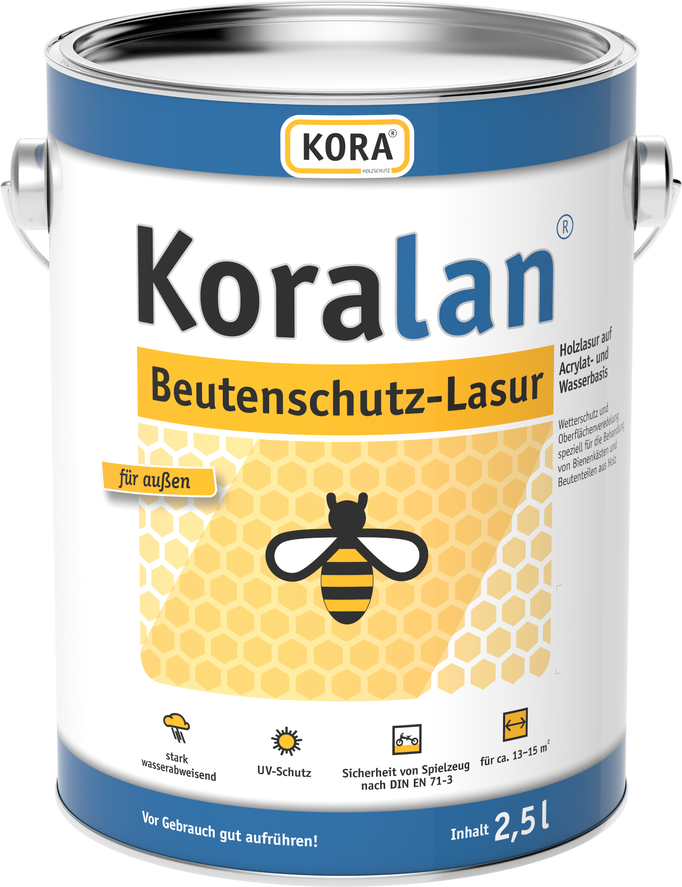 Holzlasur auf Acrylat- und Wasserbasis. Zur Oberflächenveredelung und als Wetterschutz für Holzbienenkästen und Beutenteile, Bienenhäuser und andere Holzbauteile in der Imkerei. Enthält schützende Wachse.